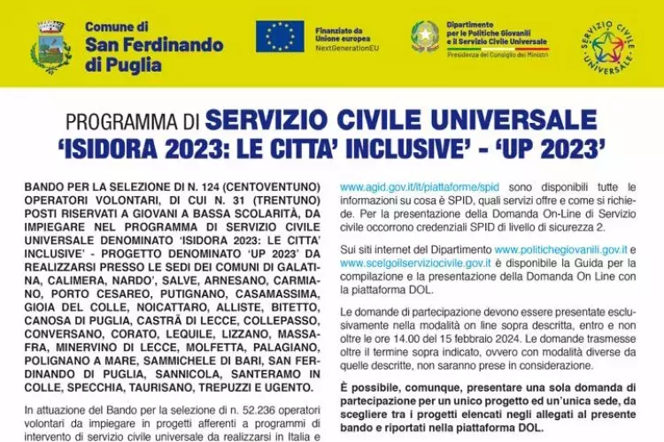 Di cui n. 31 posti riservati a giovani a bassa scolarità, da impiegare nel programma di servizio civile universale denominato "Isidora 2023: le città inclusive" – progetto denominato "Up 2023" da realizzarsi presso le sedi dei comuni di Galatina, Calimera, Nardò, Salve, Arnesano, Carmiano, Porto Cesareo, Putignano, Casamassima, Gioia del Colle, Castra di Lecce, Collepasso, Conversano, Corato, Lequile, Massafra, Minervino di Lecce, Molfetta, Palagiano, Polignano a mare, Sammichele di Bari, San Ferdinando di Puglia, Sannicola, Santeramo in Colle, Specchia, Taurisano, Trepuzzi e Ugento.